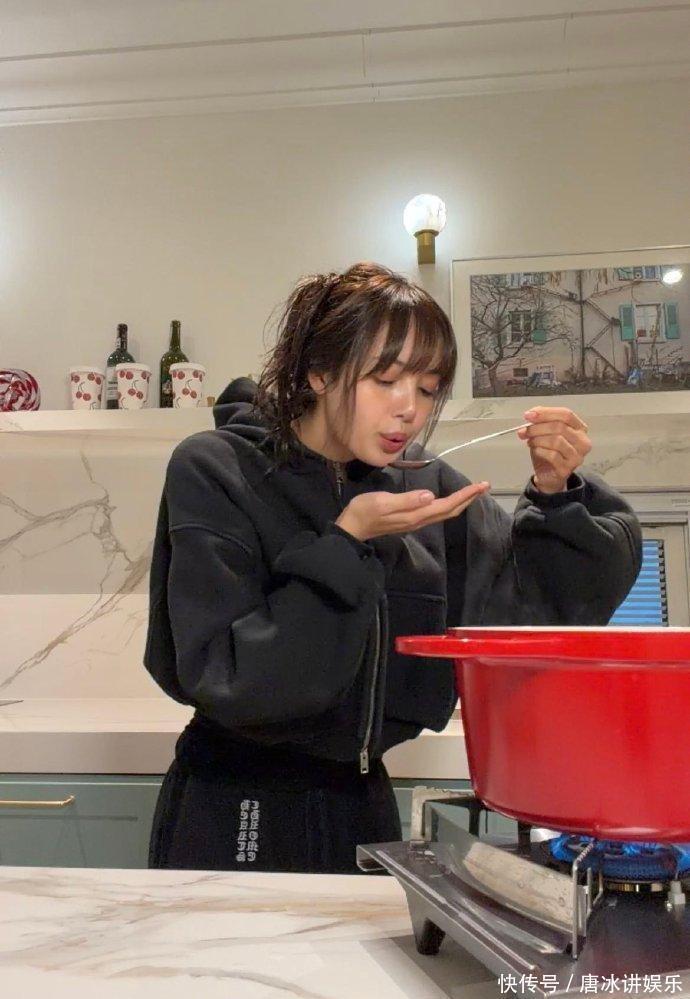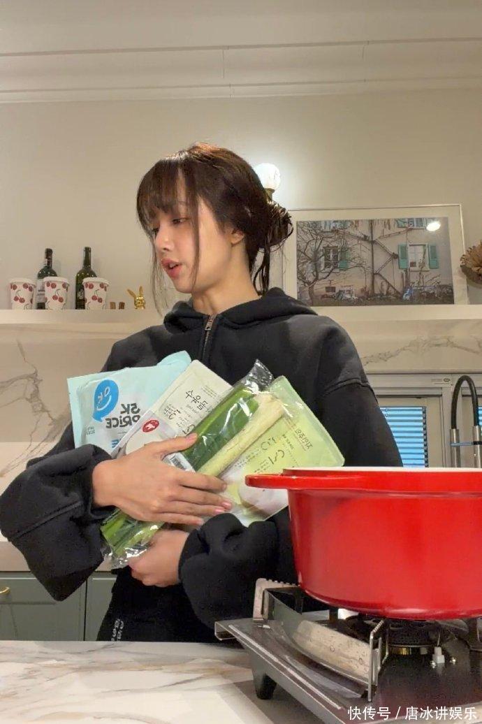 在直播中,她化身大厨,做了美味的年糕饺子汤!在穿搭上,她的家居服也很有韩系女主的感觉!黑色短款连帽卫衣,搭配黑色卫裤,休闲又舒适,给人一种慵懒随性的感觉!